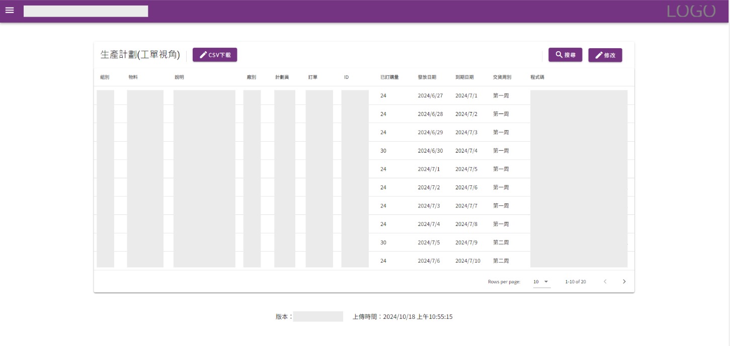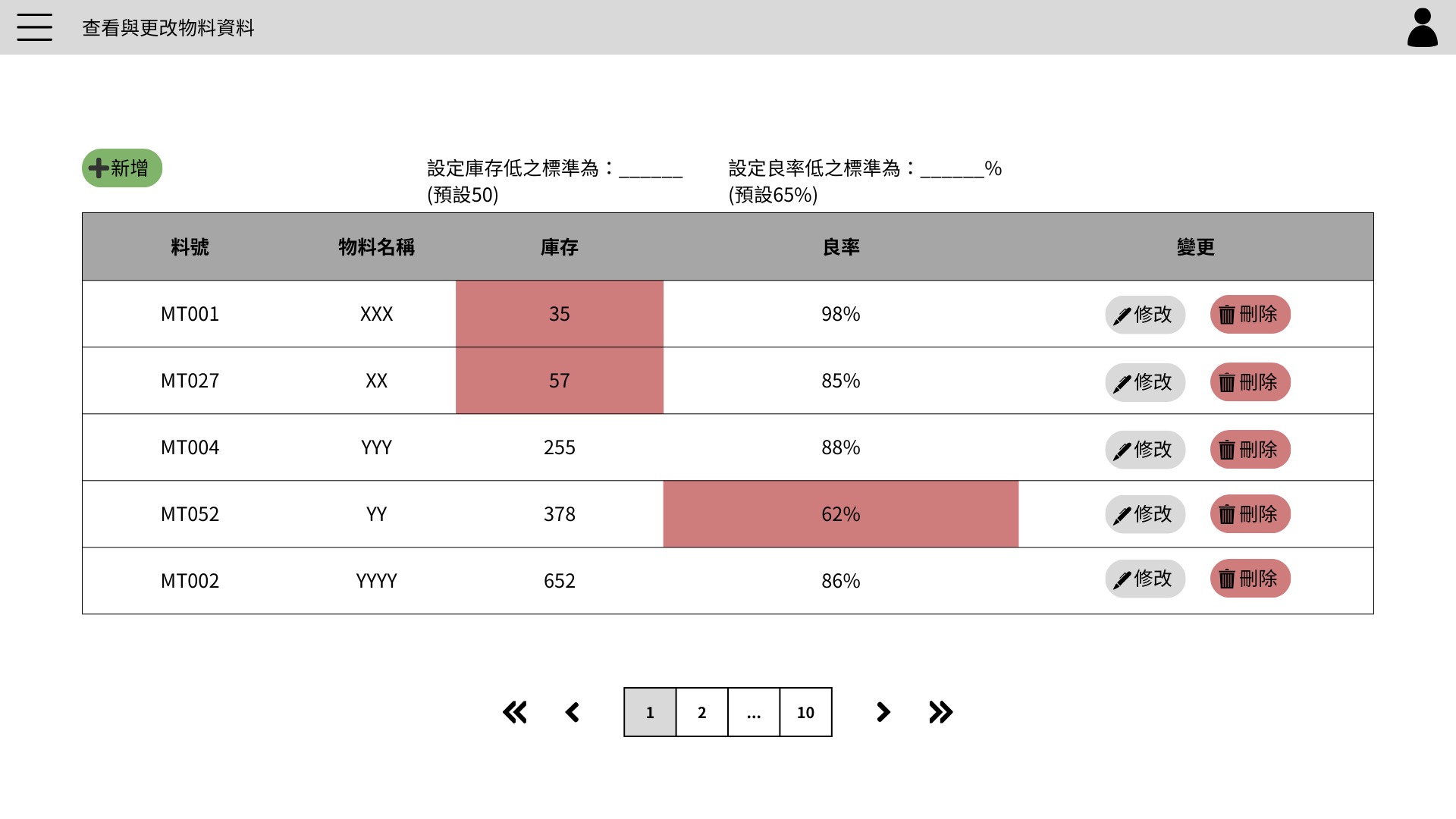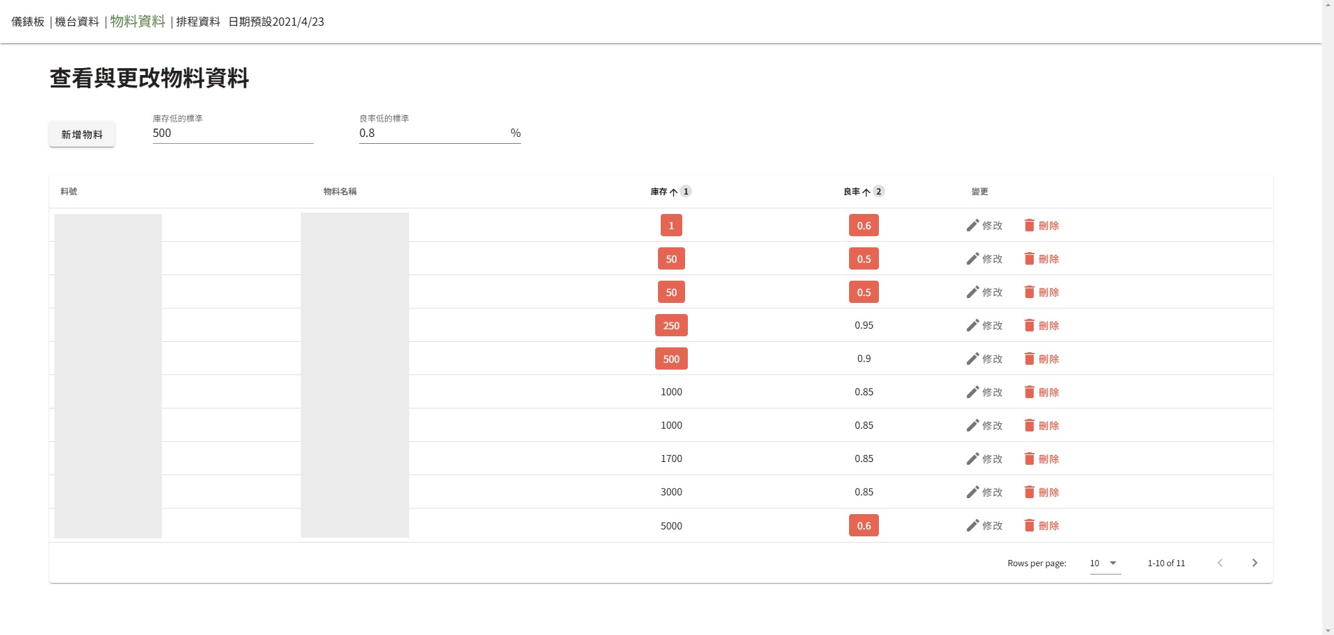 擁有基本的CRUD與欄位排序,每個欄位點選後可以按照順序進行升冪或降冪排序功能,上方輸入最低標準後會自動將不符合的資料以紅色標註,幫助使用者檢查庫存與良率情況。