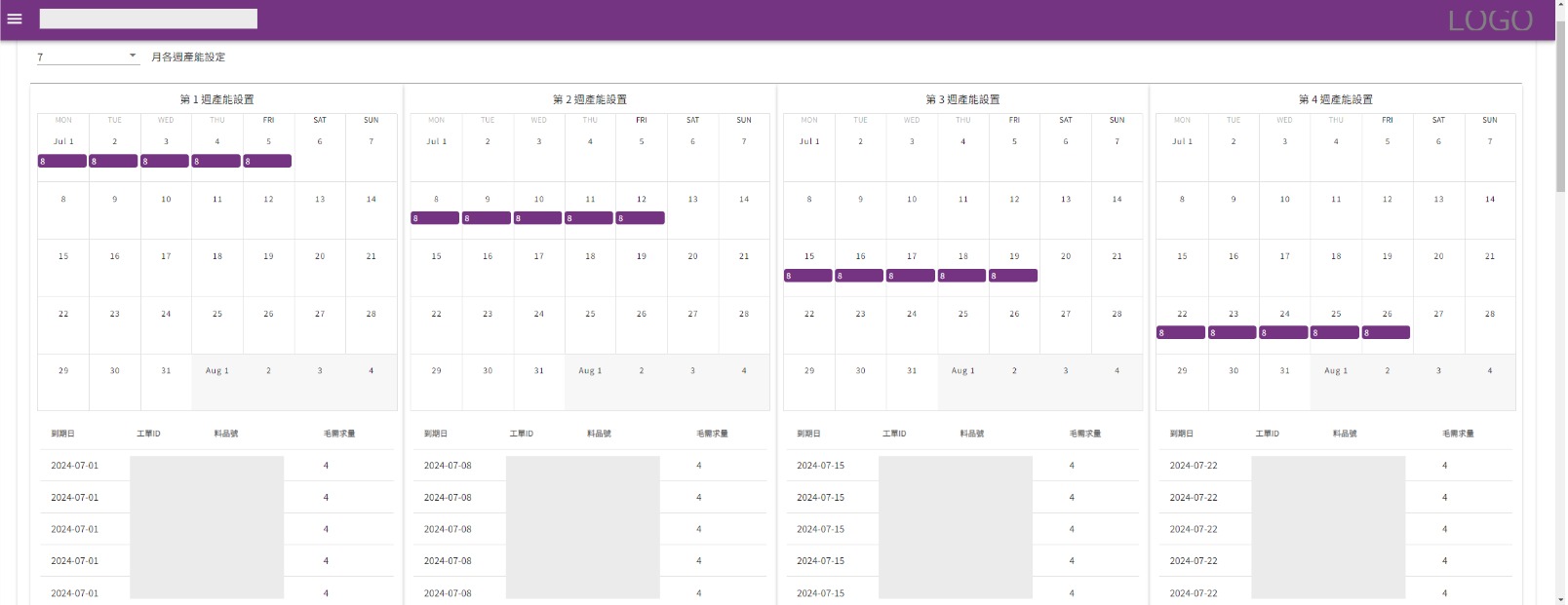以周為單位,上方為當周行事曆,下方為當周對應之所有到期工單,點選行事曆增刪可工作日與修改工作時數。
