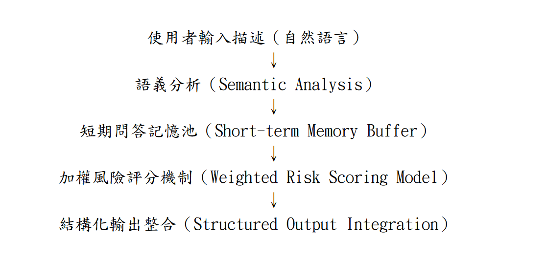 在判斷階段,系統透過加權風險評分模型計算出整體分數與風險等級,並將結果整合進最終回覆,使輸出內容同時具備量化結果與語意建議。 此流程讓模型的回應更具一致性與臨床參考價值,並有效改善先前版本中回覆模糊與重複提問的問題。